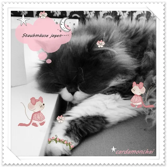 Du schläfst mit Vorliebe in der Badewanne, aber auch auf der Fensterbank, auf dem Sofa, auf dem Schreibtisch, auf dem Badvorleger, auf meinen Lieblingsschuhen und im Wäschekorb. Einmal hast Du sogar auf der Hutablage geschlafen. Ich fand Dich dort, nachdem ich Dich mal wieder stundenlang verzweifelt gesucht hatte. Du hast seelenruhig dort gelegen und von der Jagd auf Staubmäuse geträumt.