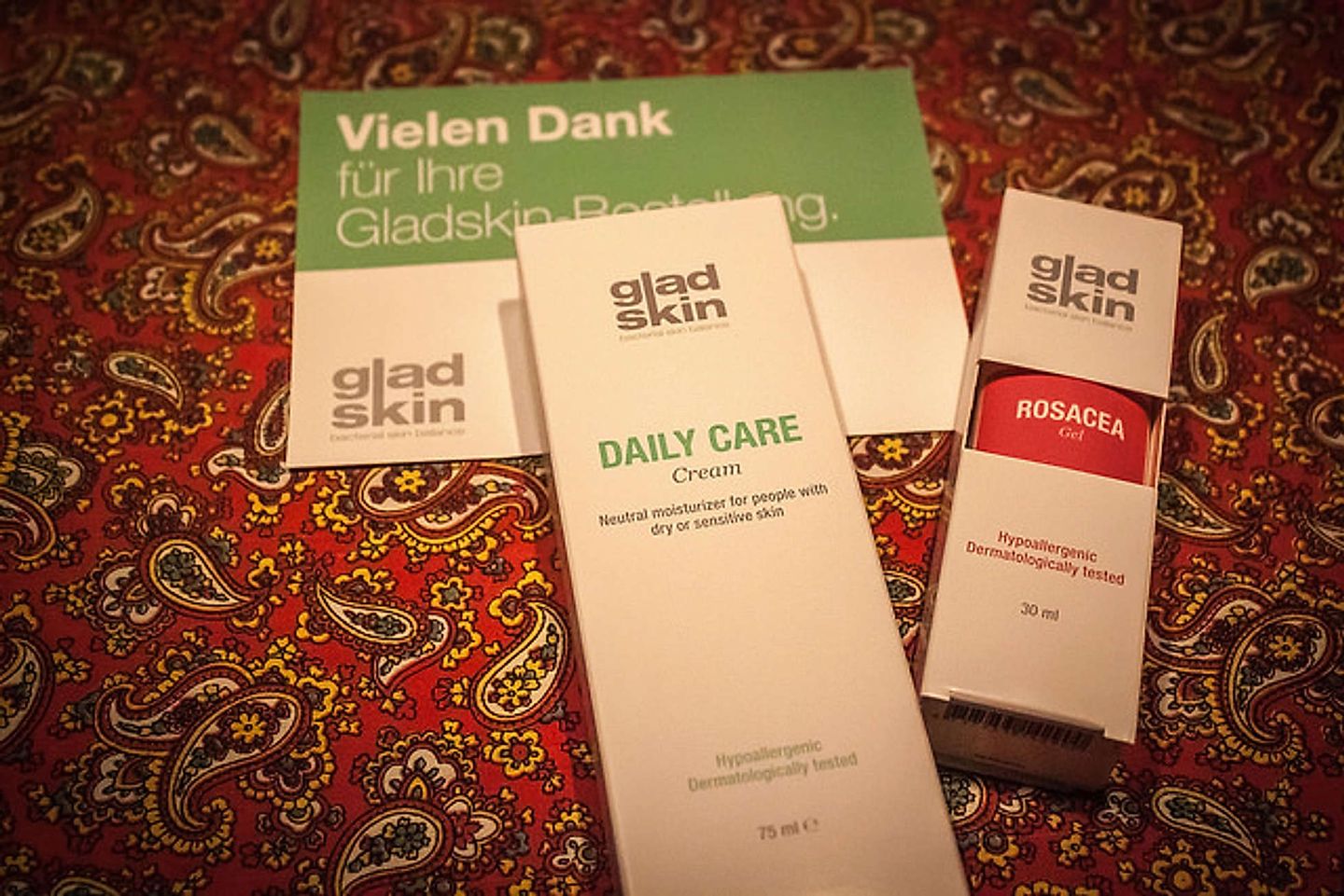 Zwei Tage später finde ich einen Umschlag mit dem Gladskin Logo im Briefkasten. Neugierig öffne ich ihn sofort. Wie versprochen, liegen zwei Produkte von Gladskin darin. Das Gel und die Pflegecreme. Zunächst mache ich ein paar Fotos für die Dokumentation. Dann starte ich den Test. Da ich gerade einen Schub habe, kann ich unter "erschwerten" Bedingungen testen. Dieses Mal ist es so schlimm, dass ich nicht mal Make-up auftragen kann, um die roten Stellen zu kaschieren, was für mich besonders unangenehm ist. Ausgehen wäre im Moment für mich ein Ding der Unmöglichkeit.
