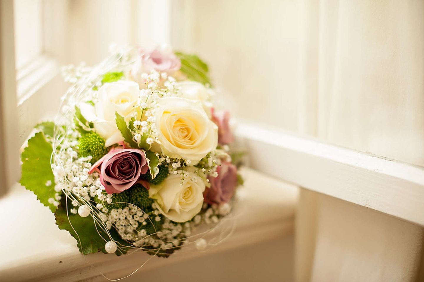 Entfernt alle Dekosachen wie Perlen etc. vom Strauß. Manche Brautsträuße sind mit Draht gebunden, auch der sollte nach Möglichkeit vorher abgenommen werden.
