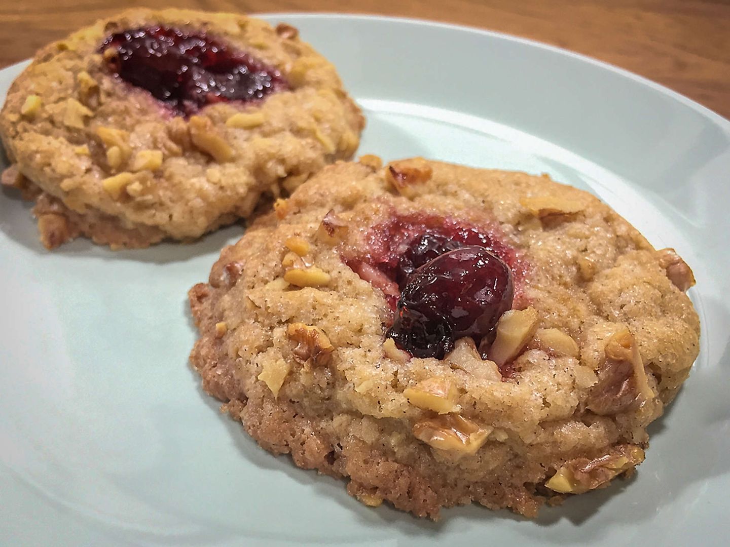 Mit dem Stil eines Holzlöffels drückt Ihr nun in jede Teigkugel ein kleines Loch. Gebt je nach Größe ein bis drei Cranberries in in jedes Loch. Wenn Ihr fertig seid stellt Ihr Eure Cookies für 16 Minuten in den vorgeheizten Ofen. Danach lasst Ihr sie auf einem Rost gut auskühlen, wodurch sie ihre endgültige Konsistenz annehmen. Lagern könnt Ihr sie am besten in einer Blechdose. Die einzelnen Lagen solltet Ihr mit Back- oder Butterbrotpapier trennen.