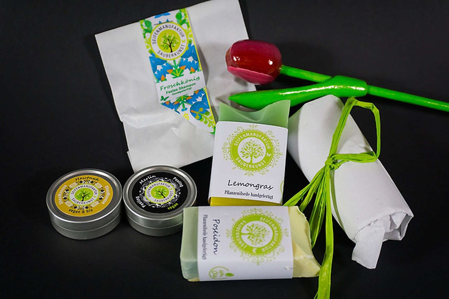 Alle Produkte von Sauberkunst sind frei von Palmöl und Mikroplastik. Gefertigt werden sie im Brandenburger Land. Gekauft werden kann online oder in den beiden Verkaufstellen in Groß Kreutz, Werder/Havel und im Berliner Nicolaiviertel.