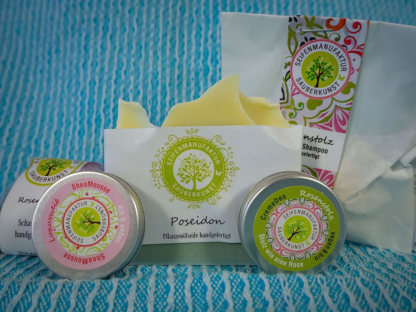 Besonders toll finde ich wie immer die himmlisch duftenden Körperseifen. Ich liebe es, damit zu duschen. Ganz ohne Plastik und ganz ohne schlechtes Gewissen. Dem Paket lagen die Sorten "Lindenblüte", "Poseidon" und "Hautnah" bei.