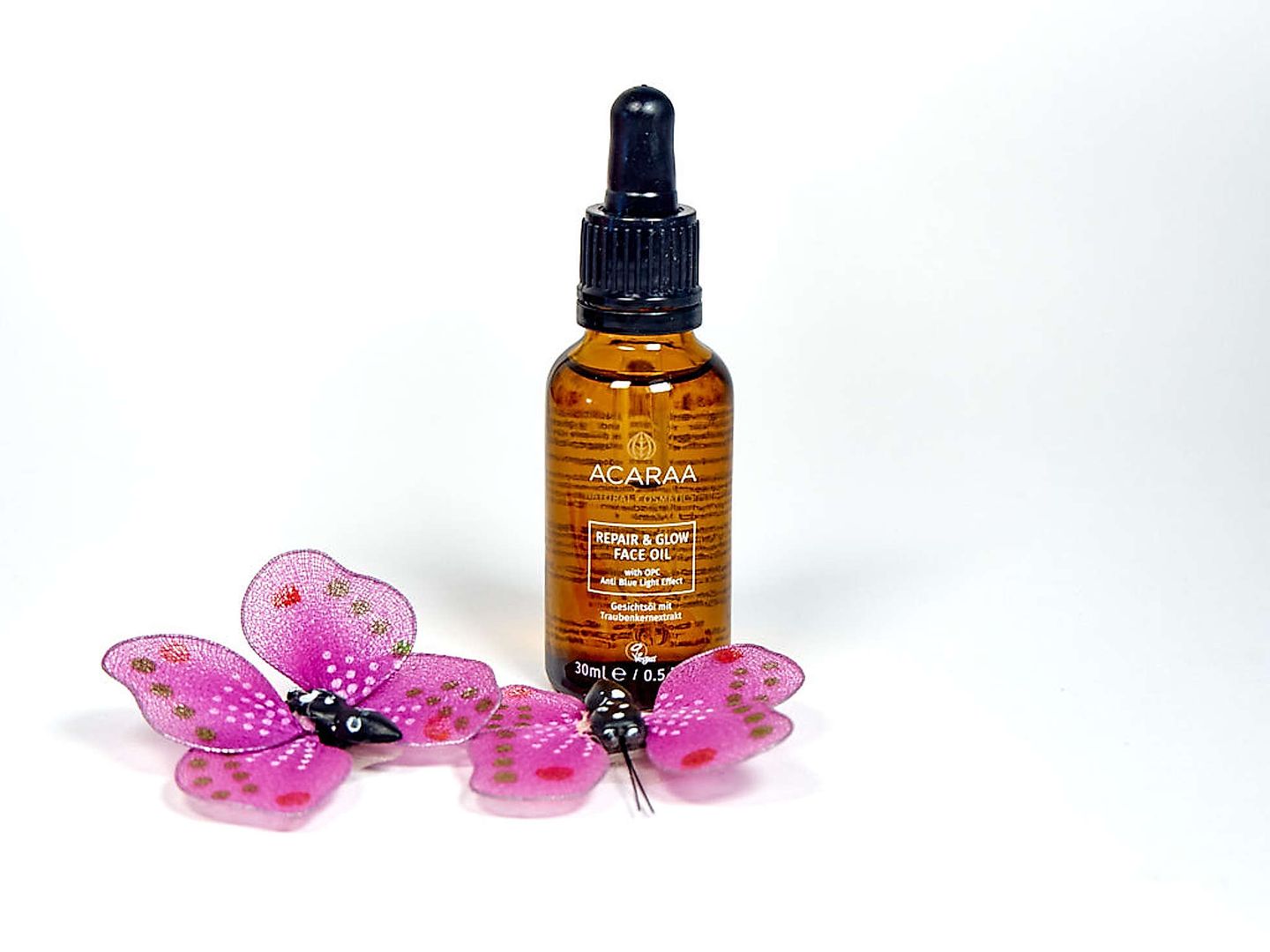 Das ACARAA Repair & Glow Gesichtsöls mit Traubenkernextrakt und Radicare Gold ist mit diesen wirksamen Radikalfängern ausgestattet. Sie sollen und den Einfluss des blauen Lichts auf die Haut bremsen. Das Anti Aging Gesichtsöl soll die Hautzellen reparieren und schützen. Außerdem wirkt es hydrierend und wirkt Hautunreinheiten entgegen. Das funktioniert, indem es der Haut das Signal übermittelt, dass sie weniger Fett produzieren muss. Wenn sie von außen gut mit dem notwendigen Fett versorgt ist, stellt sie ihre überflüssige Talg-Produktion automatisch ein.
