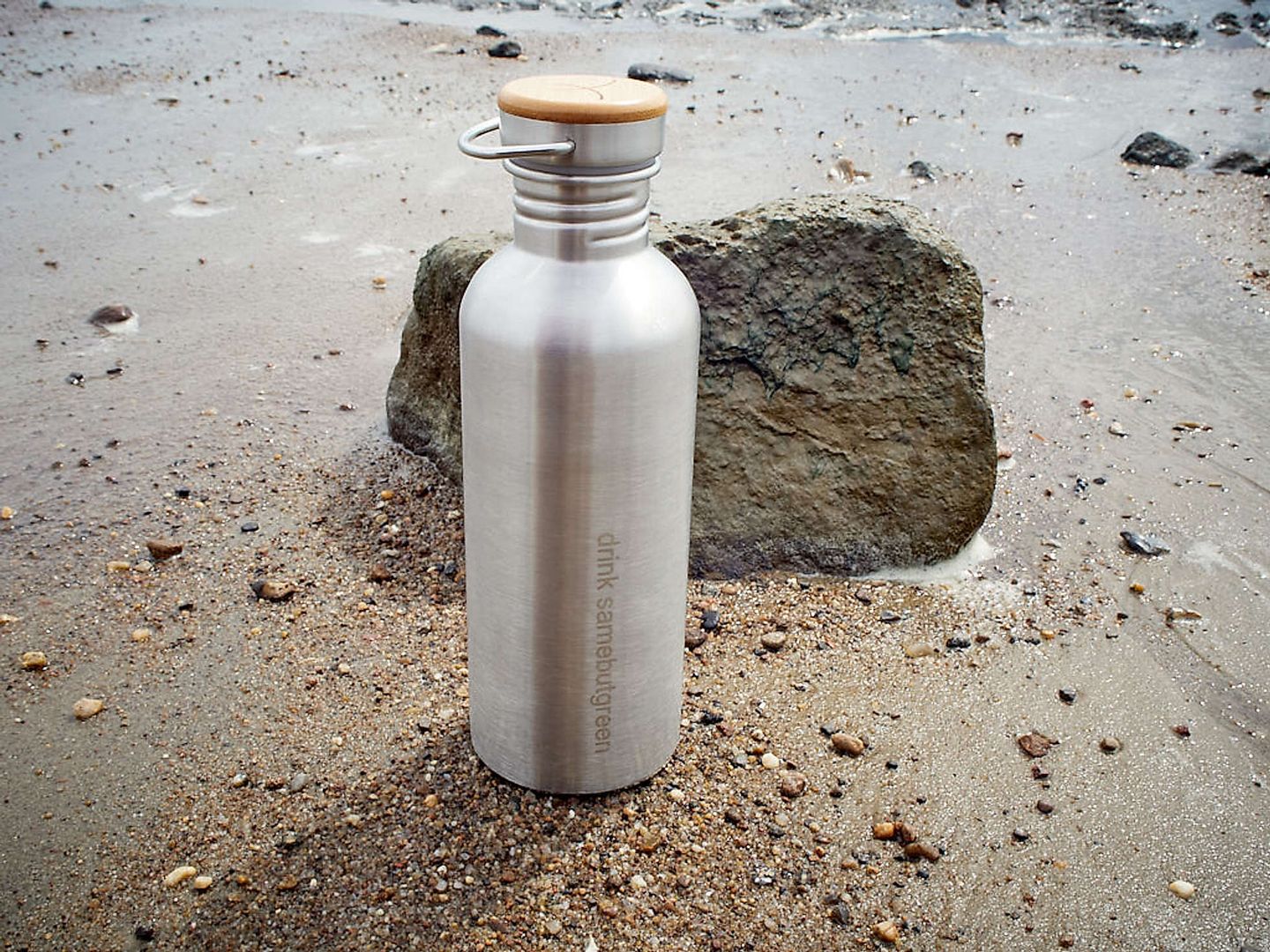 Meine treue Begleiterin auf Fahrradtouren und Wanderungen ist das 1-Liter-Edelstahl-Modell von samebutgreen. Die Flasche ist schön leicht und robust und hat einen praktischen Tragebügel. Ich kann sie mit einem Karabinerhaken am Rucksack befestigen oder in meiner Fahrradpacktasche verstauen. Das Design ist schlicht und schön. Ein tolles Detail ist für mich der Holzdeckel mit dem eingeprägten Emblem. Für den kleinen Durst oder für Schulranzen, Turnbeutel und Co. gibt es die samebutgreen Flasche auch mit 500 ml Fassungsvermögen.