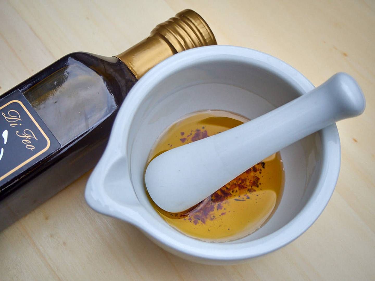 Wenn Ihr sofort Chili-Öl braucht, könnt Ihr die Schoten auch mithilfe eines Mörsers direkt im Öl zerkleinern. Das klappt auch hervorragend mit Kräutern, Meersalz und Knoblauch. Probiert es am besten einfach aus. Der Fantasie sind keine Grenzen gesetzt.