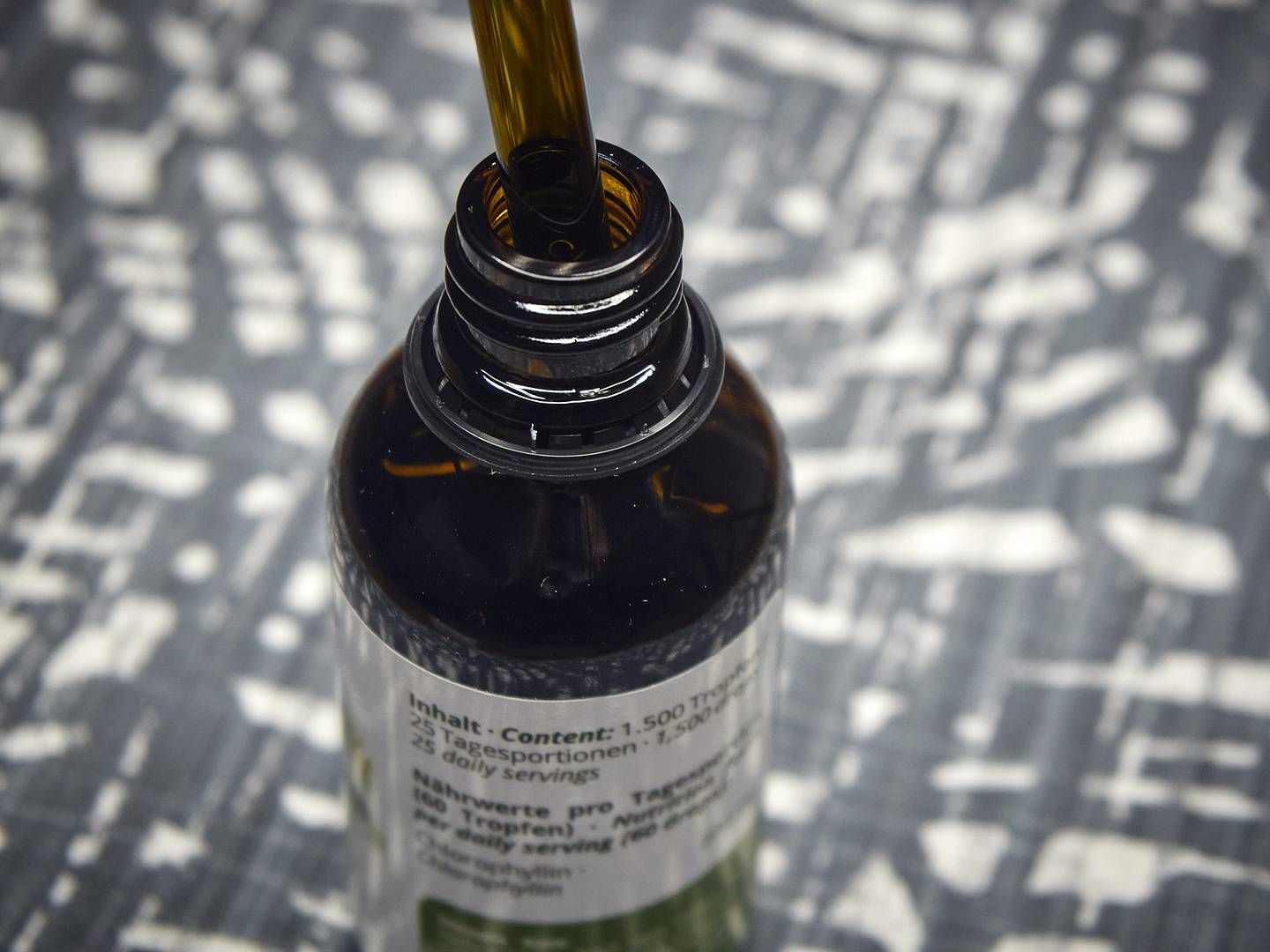 Die Tropfen von Nutri Plus enthalten 50 ml flüssiges Chlorophyll. Es wird aus spanischem Alfalfa gewonnen. In der Flasche befindet sich eine praktische Pipette, mit der ihr die Tropfen ganz einfach dosieren könnt. Zusätze sind keine enthalten, es handelt sich um reines Chlorophyllin – ein Naturprodukt. Wie alles aus dem Hause Nutri Plus sind auch die Chlorophyll-Tropfen zu 100 Prozent vegan und frei von Laktose, Milcheiweiß oder anderen tierische Inhaltsstoffen.