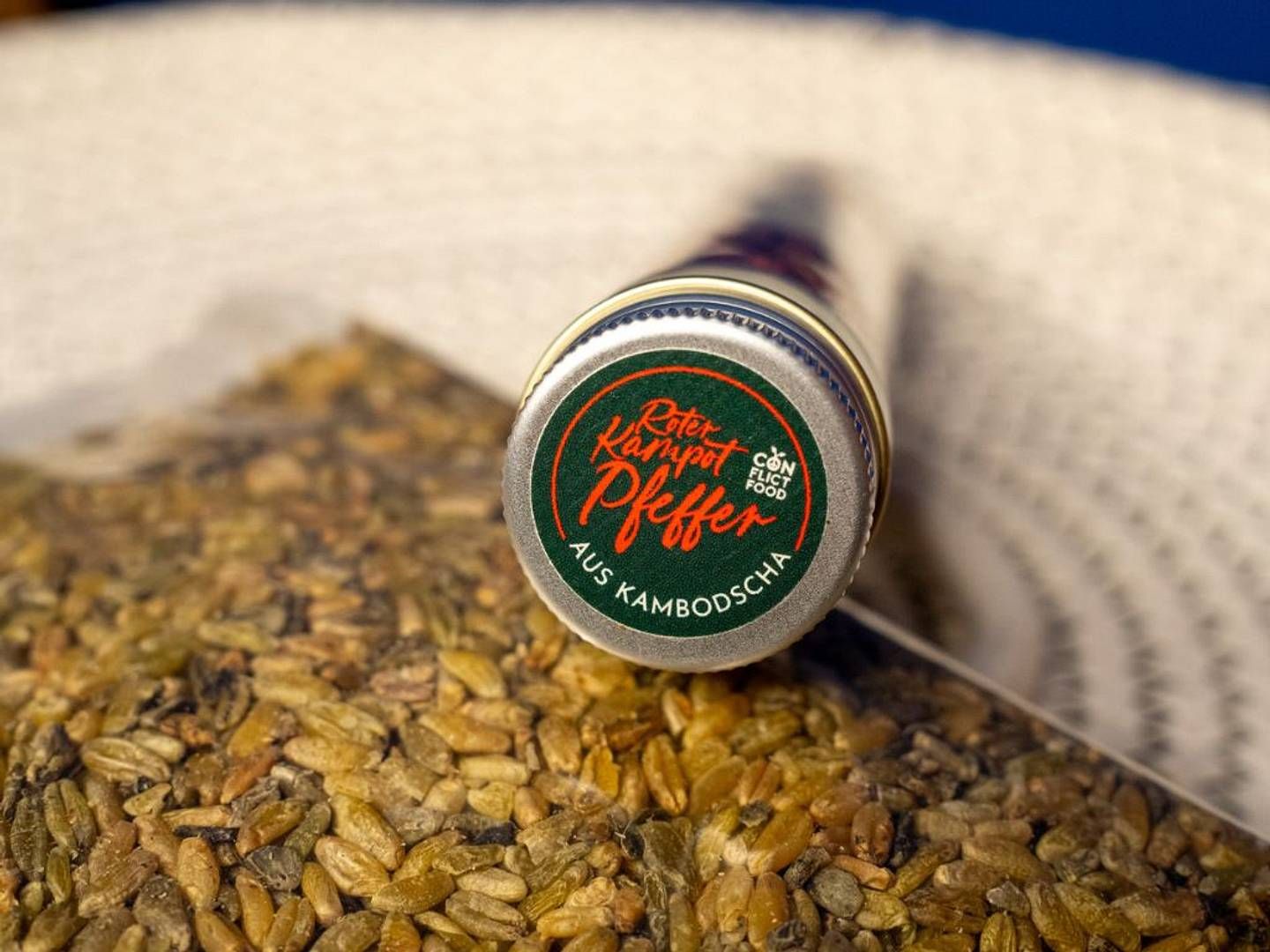 Die berühmtesten Sterneköch*innen können inzwischen von dem besonderen Pfeffer aus Kambodscha nicht mehr genug bekommen – kein Wunder, er ist wirklich ein Genuss. Insgesamt gibt es bei Conflictfood drei Sorten. Ich selbst habe den roten Kampot Kampot Pfeffer in Verwendung. Ich nutze ihn nicht komplett gemalen (höchstens mal zusammen mit etwas Meersalz im Mörser, das passt gut zu selbst gemachten Kartoffelchips), sondern nur leicht angedrückt – zum Beispiel in Salaten oder als Topping auf Bowls.